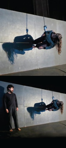 Dividido, entrecortado, tensionado, por vezes rompido, o espaço é atravessado por um plano vertical de 4 metros de comprimento por 2 metros de altura. Confinadas, amarradas a duas cordas que as prendem ao teto, duas pessoas tentam. Órbita dá continuidade à pesquisa de dança vertical da Companhia Suspensa.