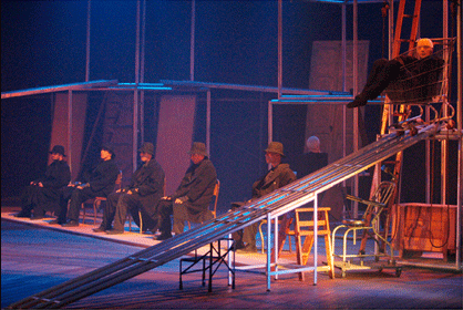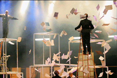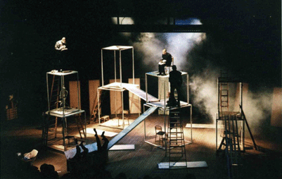 Nesta encenação os atores falam, gritam, sobem e descem