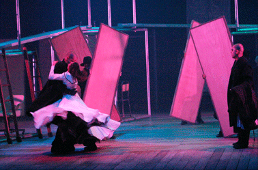 bonecos e circulam por um cenário móvel, composto de portas,